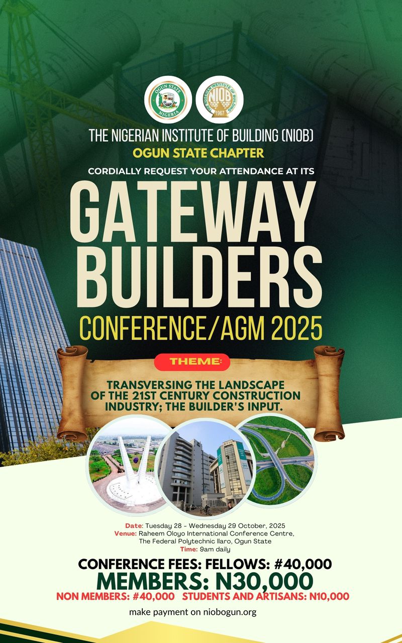 The Nigerian Institute of Building (NIOB), Ogun State Chapter, has announced its readiness to host the highly anticipated 2025 Gateway Builders Conference, scheduled to take place from Tuesday, 28th to Wednesday, 29th October 2025, at the Raheem Intel Conference Centre, Federal Polytechnic, Ilaro, Ogun State.