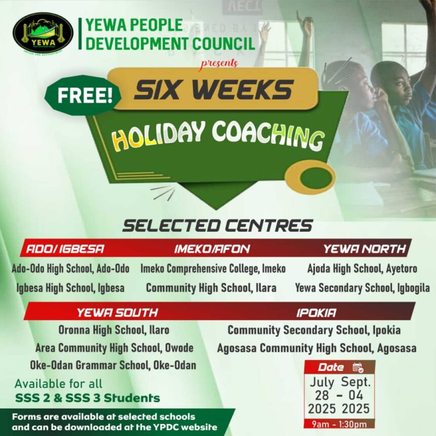 The Yewa People Development Council (YPDC) has announced a free six-week holiday coaching program aimed at helping Senior Secondary School (SSS) 2 and SSS 3 students in the Yewa region. This coaching initiative, which will take place between July 28 and September 4, 2025, is designed to ensure students stay engaged and continue learning during the long school break.